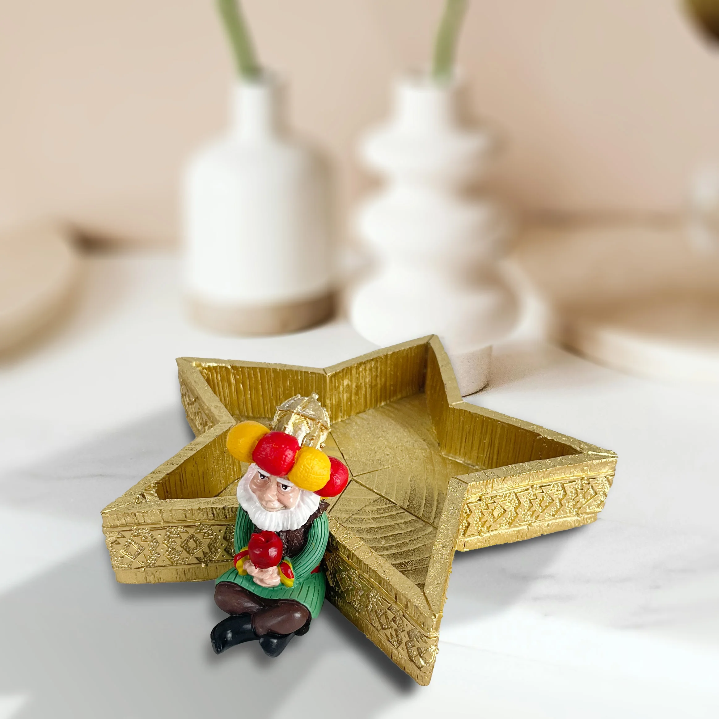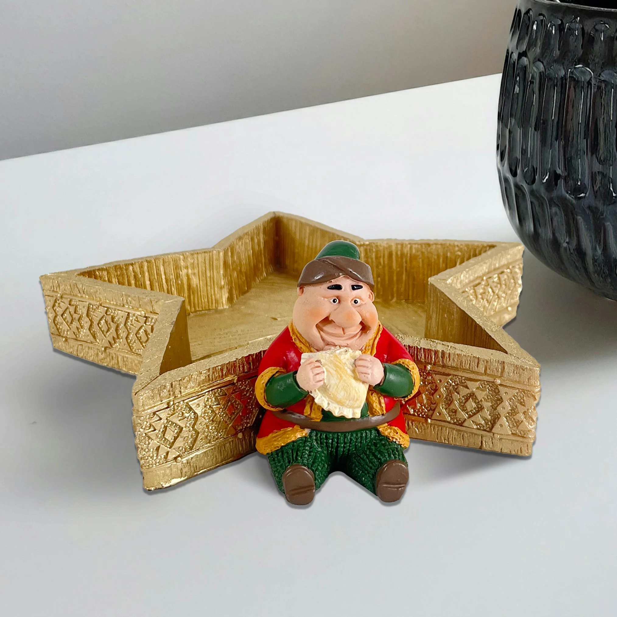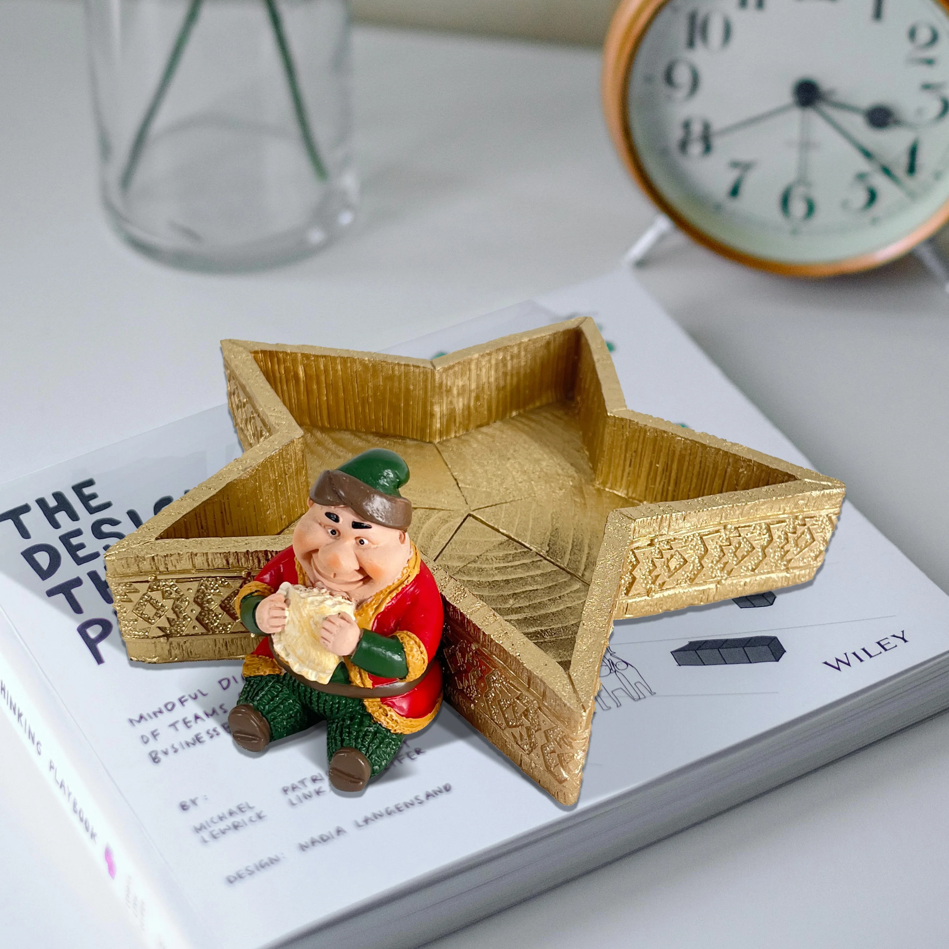 طبق تقديم أنيق يجمع بين الحداثة والذكريات الجميلة، يأتي بتصميم نجمة ذهبية مزخرفة بنقوش هندسية راقية. يتوسط الطبق مجسم لشخصية "طمطم" المحبوبة بتفاصيل ملونة ودقيقة.